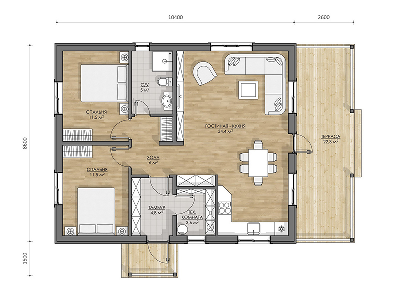 Терраса 2, 6х8, 6 м и 1, 5х2 м: